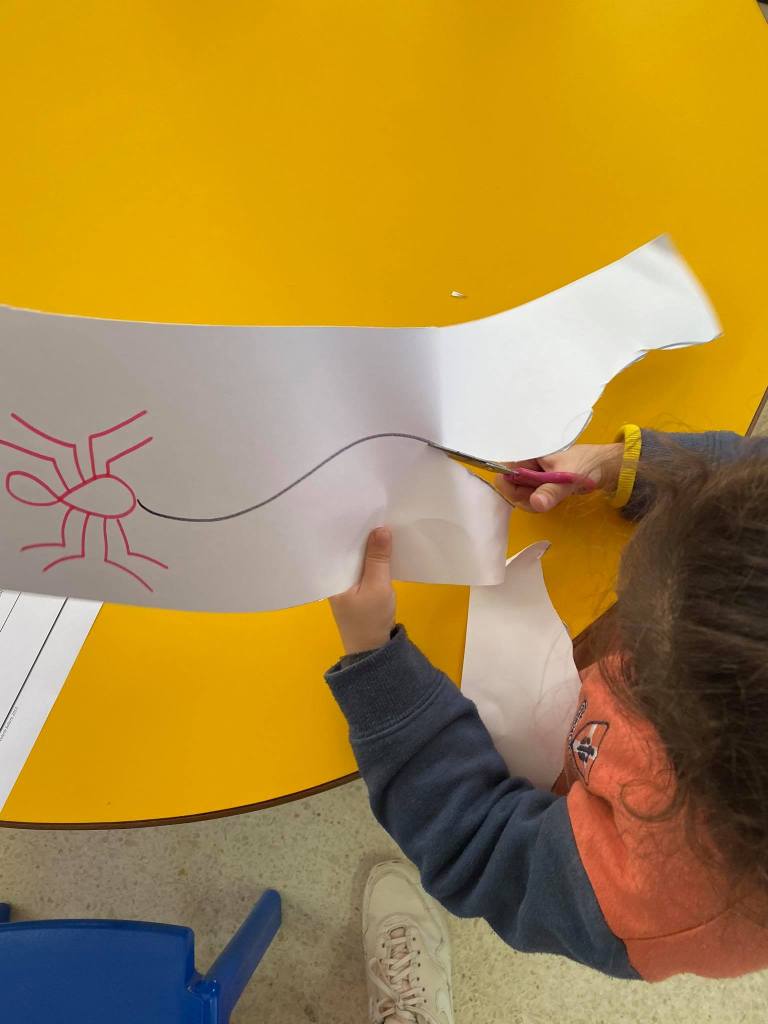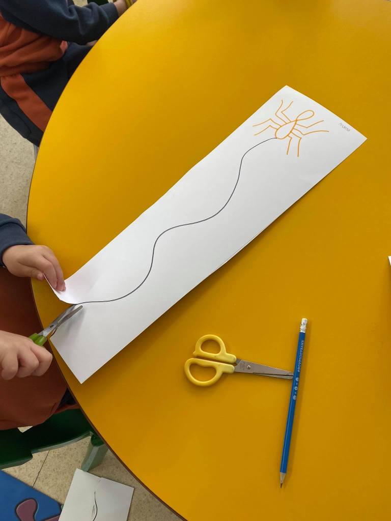 In continuing to enhance their fine motor skills, during this activity the children used a pair of scissors to cut a piece of cardboard. The cardboard involved a drawing of a spider and a thread hanging down from it.