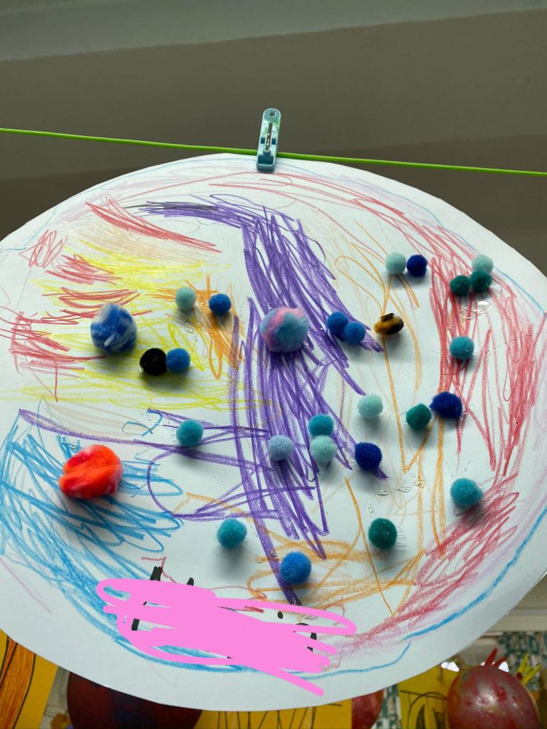 The children also continued to expand this activity when they wanted to print paint on a piece of cardboard using the balloons. See below for pictures of their products.